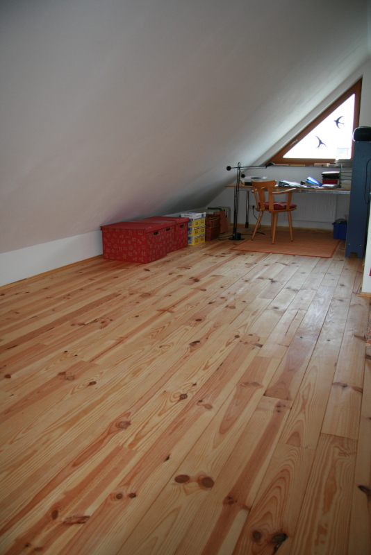 Äste und etliche kleine Längsharzgallen bis max. 1x5 cm . Einige Mark- und Hirnrisse sind üblich. Der französische Hersteller klassifiziert diese Dielen als A/B -Qualität.